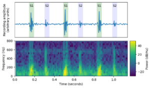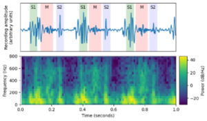 Each recording is transformed into a spectrogram – a visual representation showing how sound frequencies change over time, much like a heat map of the heartbeat (Figures 1–3). These patterns allow the AI system to recognise subtle differences in heart sounds.