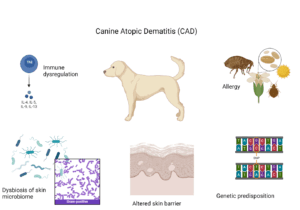 CAD is a genetically predisposed condition with a complex aetiopathogenesis (Figure 1). It involves poor skin barrier function, altered skin inflammation, allergies (in most but not all dogs) to environmental, food and/or Malassezia allergens, and dysbiosis of the skin microbiome (Marsella, 2021; Meury et al., 2011). However, the causes and disease phenotype differ among breeds and between individuals, which is in part due to the varied and largely undefined genotype that varies between breeds and gene pools (Nuttall, 2013). Polymorphisms in numerous genes, mostly associated with immune regulation and skin barrier function, have previously been associated with CAD (Tengvall et al., 2013; Wood et al., 2009; Agler et al., 2019), while skin barrier dysfunction and microbial colonisation may contribute to the onset of disease and worsening of clinical signs (Marsella, 2021). A compromised skin barrier facilitates the penetration of allergens, irritants, and microbes that stimulate immune cells and inflammation. A T helper 2 (Th2)-type immune response is often involved in the initiation of disease with the release of pro-inflammatory cytokines that promote inflammation of the skin through thymic stromal lymphopoietin and innate lymphoid cells (Früh et al., 2020; Olivry et al., 2016). An itching sensation is caused by pruritogens (particularly IL-31) binding to receptors on sensory nerve endings, which send signals through the dorsal root ganglion to the spinal cord up the spinothalamic tract then into the brain (Wheeler et al., 2019; Olivry et al., 2016). The Janus kinase-signal transducer and activator of transcription (JAK-STAT) signalling pathway also mediates cellular responses in inflammation and itch (Blubaugh et al., 2024; He et al., 2024). The disrupted skin barrier and immune dysregulation foster a dysbiotic skin microbiome, with overgrowth of organisms like Staphylococcus and Malassezia spp., which further exacerbate inflammation (Pierezan et al., 2016).